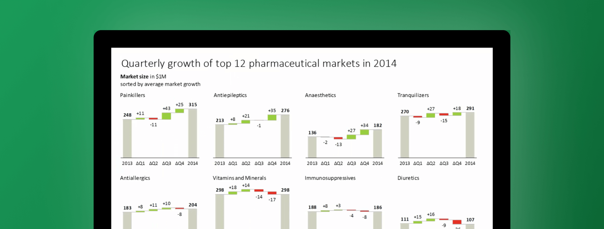 Countless times I was in a situation where small multiples of, say, 12 waterfall charts would be perfect for my customer's dataset and intended message, but I dismissed the thought in a split of a second. Imagining I have to produce a bunch of Excel formulas for dummy chart series, apply all those hacks and tricks to make the charts effective and visually correct, adjust the labels, apply the design, etc. And do all that 12 times for 12 charts, take care of proper scaling, solve the labelling of categories based on the position of charts within the matrix, ... Huh, just forget about it. It's frustrating.