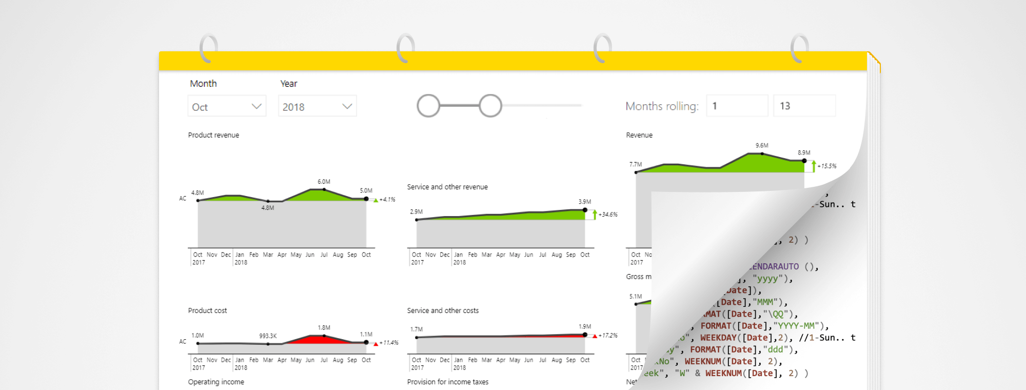 In this instance you control the month as well as the year and the two slicers (Month and Year) give you dynamic 13-month rolling periods on your axis that you control. This is very useful for marketing dashboards with data like market share, because you want to actually compare the June of this year to June of last year. It also works for operational reports showing data like on-time delivery in percentages and similar.