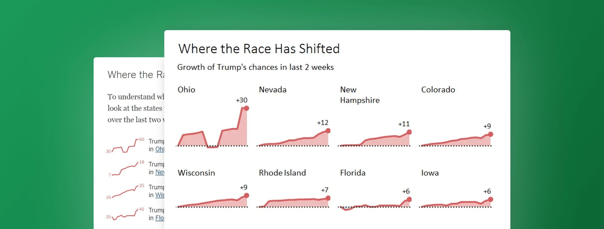 In the recent update of The New York Times's article Who Will Be President? the authors used an interesting and a slightly controversial infografic, consisting of 16 sparklines. The graphic depicts the trends of Donald Trump's winning probabilities in the states, where his chances have increased most over the last two weeks.